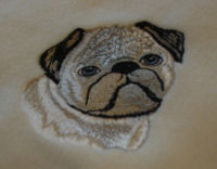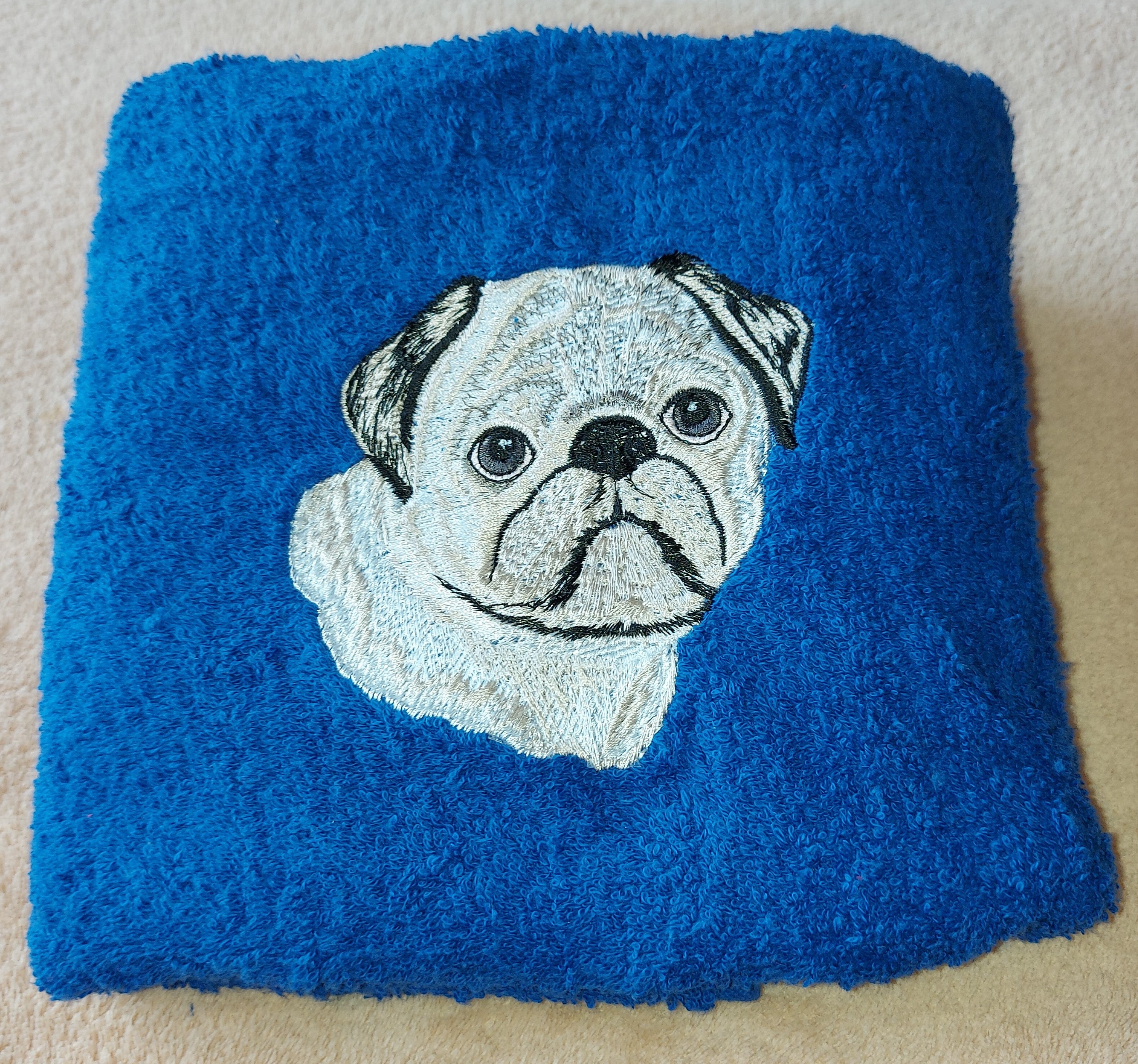 Handtuch/Dusch-oder Saunatuch mit einem schönen Mops bestickt!