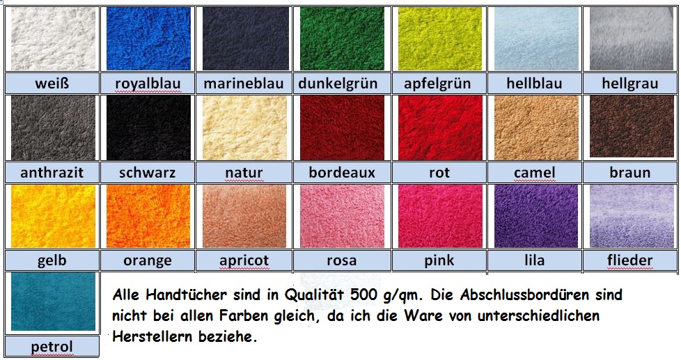 Material: Gewicht 500 g/m² hochwertiger Frottee aus 100 % Baumwolle, einem verstärktem Abschluss und einem höchst angenehmen, flauschigen Gefühl auf der Haut